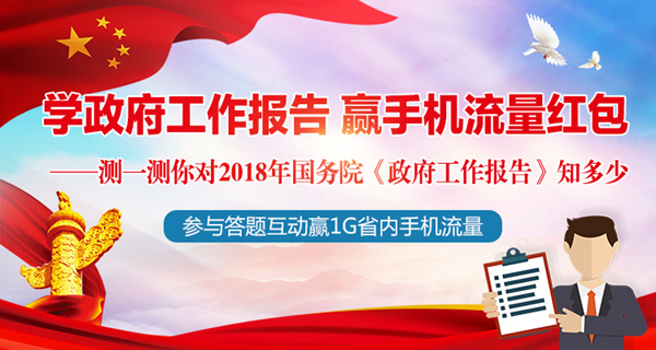 你对2018年国务院《政府工作报告》知多少呢?快来测一测吧!为深入学习贯彻党的十九大精神,增强广大网友对2018年国务院《政府工作报告》的理解和认识,营造良好的社会氛围,河南省人民政府办公厅联合省通信管理局举办的“学政府工作报告 赢手机流量红包”有奖答题活动于3月22日正式启动,欢迎广大网友下载“河南政务”客户端,参与有奖答题。