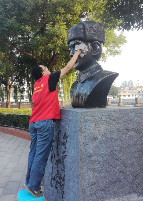 志愿者认真清洗雷锋雕像,向雷锋致敬